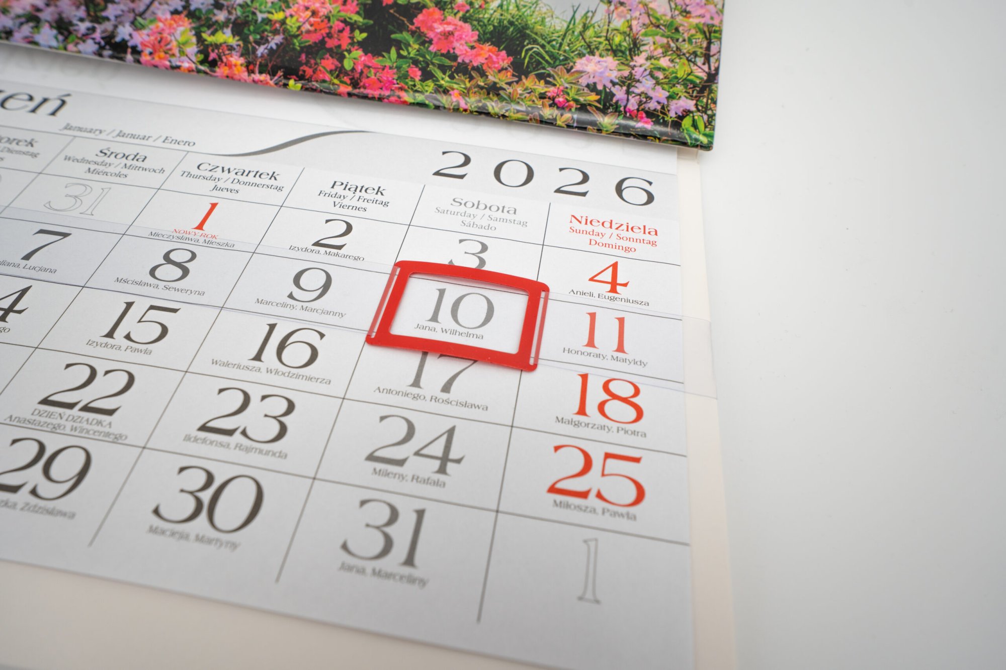 - Z gumką z folii o grubości 0,15 mm. Pasek wraz z ramką okienka mocowany jest na kalendarium za pomocą elastycznej gumki kauczukowej. Pasek wykonany jest z wysoko przeźroczystej folii PVC o grubości 0,15 mm i długości odpowiednio dobranej do szerokości kalendarium, co zapewnia stabilne trzymanie się paska oraz „nie zwijanie” się kalendarium pod wpływem napięcia gumki.